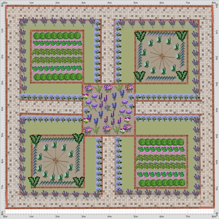 Simple style potager with colour themed mixed planting and a small cutting area in the centre with Asters, Hyssop and Bells of Ireland for house flower arrangements. Designed for an urban environment to soften the area between the house and the street. All materials used in the paths and edging are reclaimed.
