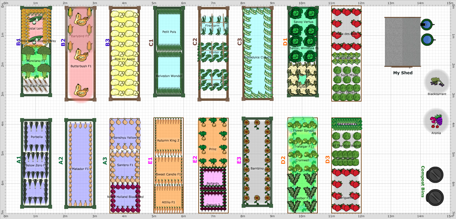 | | Plant | Number | Spacing | Spacing in Rows | Notes |